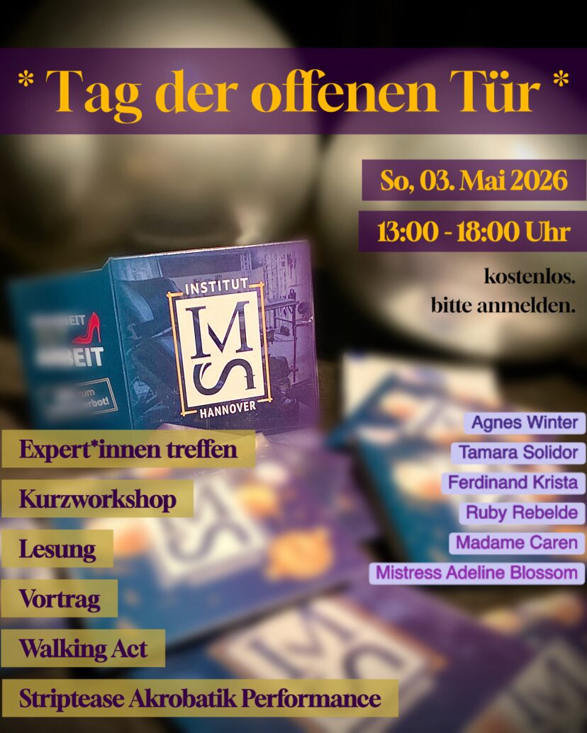 Triff Expert*innen auf einen Plausch und schlendere in Ruhe durch die Räumlichkeiten: Informationen rund um Sexarbeit, Gesundheit und Gesetzgebungen gibt es an dem Infotisch von Phoenix – Fachberatungsstelle für Sexarbeitende. Sexarbeitsfeindlichkeit – so heißt die Diskriminierung, der Sexarbeiter*innen bis heute ausgesetzt sind. Ruby Rebelde liest kurze Passagen aus dem 2025 erschienenem Buch „Warum sie uns hassen – Sexarbeitsfeindlichkeit“. In ihrem Vortrag bettet Saskia Apelt-Schunk das Institut IMS in die Entwicklung der Sexarbeit in Hannover ein. Eine feurige akrobatische Performance erwartet euch beim Hannover-Debüt von Angel, bei der sie ihre zuckersüße Persönlichkeit mit ihrem lodernden, leidenschaftlichem Herzen verbindet. Tamara Solidor gewährt in „What´s in my Sextasche“ einen ehrlichen Blick in ihre Arbeitstasche und zeigt, was wir daraus lernen können. Eine Kurzvisite in den Klinik-Kink macht Agnes Winter und demonstriert, was eigentlich Heavy Rubber ist.